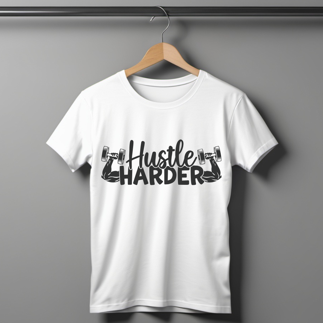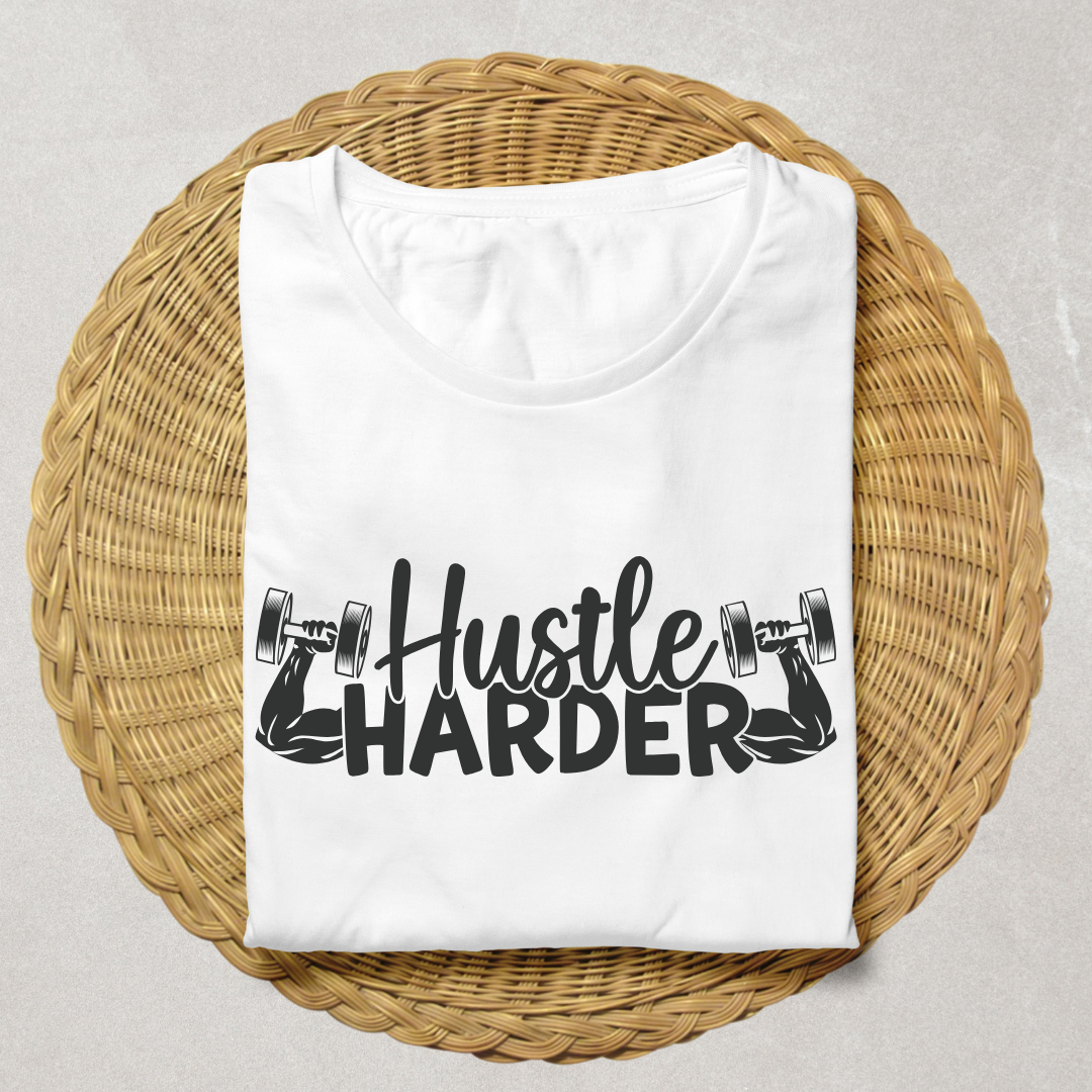 - Motivational Design: Featuring the empowering message "Hustle Harder" with a sleek barbell graphic, this T-shirt is designed to inspire your workouts and showcase your dedication to fitness.